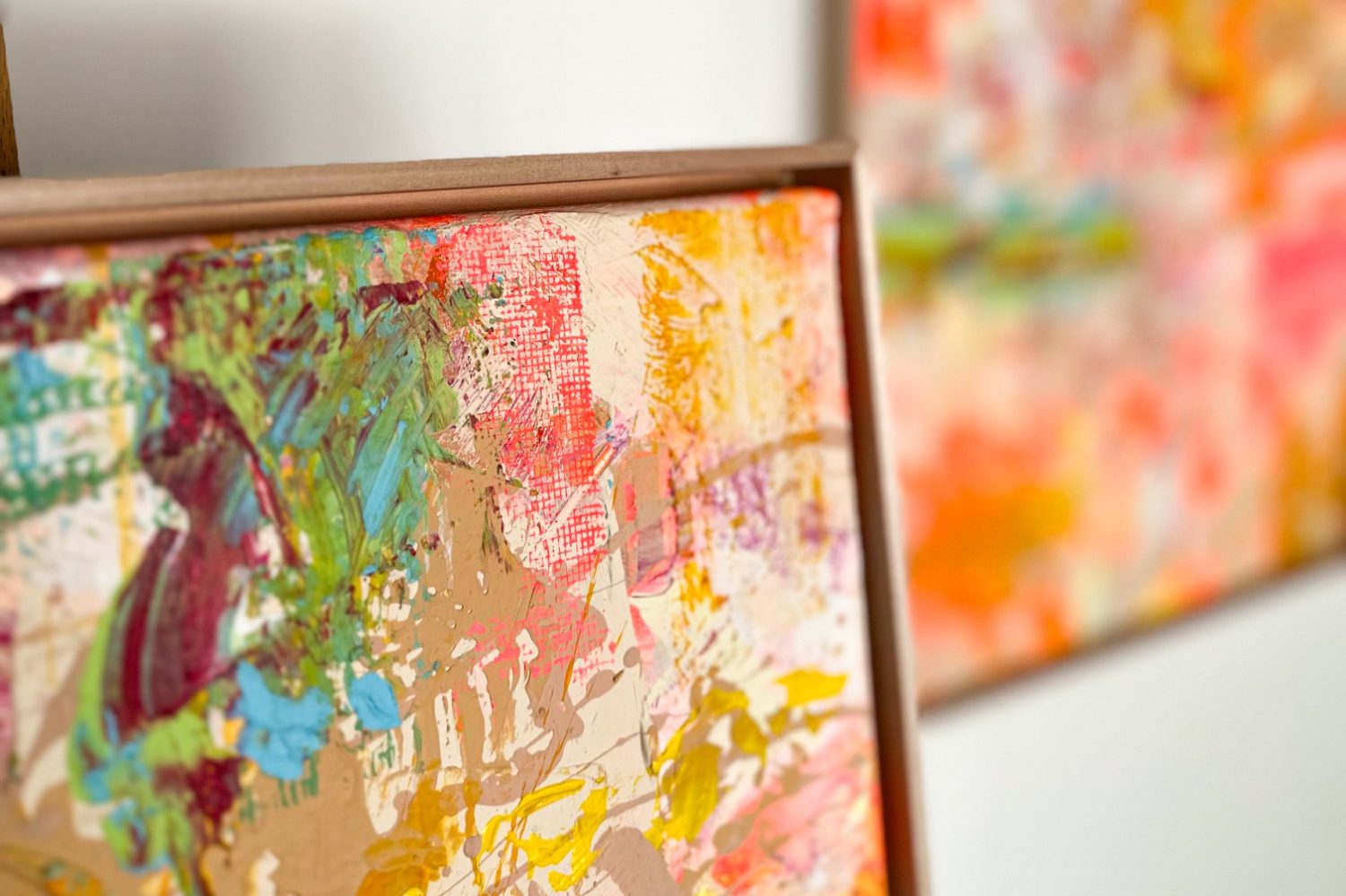 Gemalt wird mit Acrylfarben, Naturpigmenten und viel Wasser auf einer handgefertigten, ungrundierten Leinwand.
